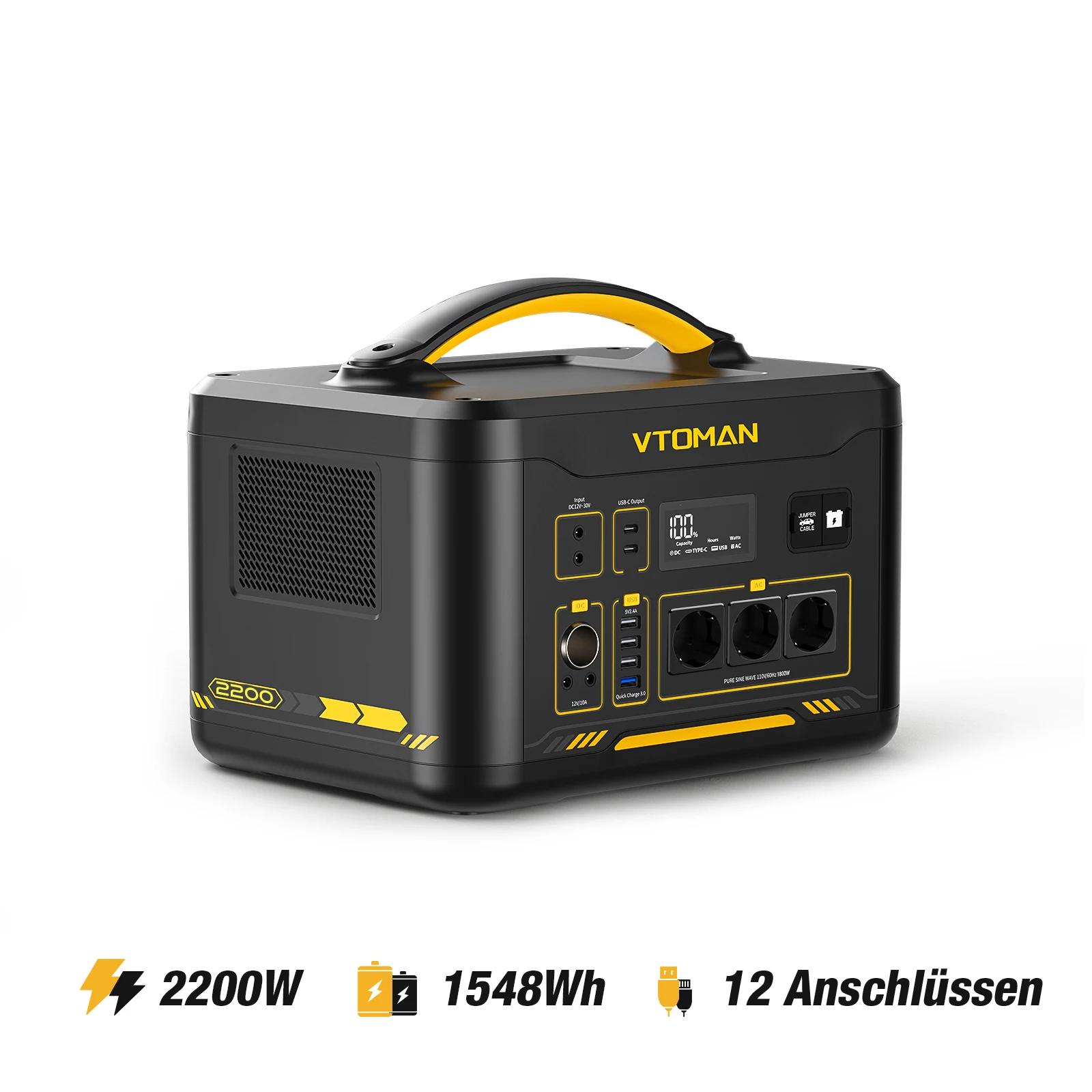 AC Outputx3: JUMP 2200 2200W in total(Peak 4400W), 220V~50Hz,JUMP 1800W in total(Peak 3600W), 110V~60Hz, Pure Sine Wave
